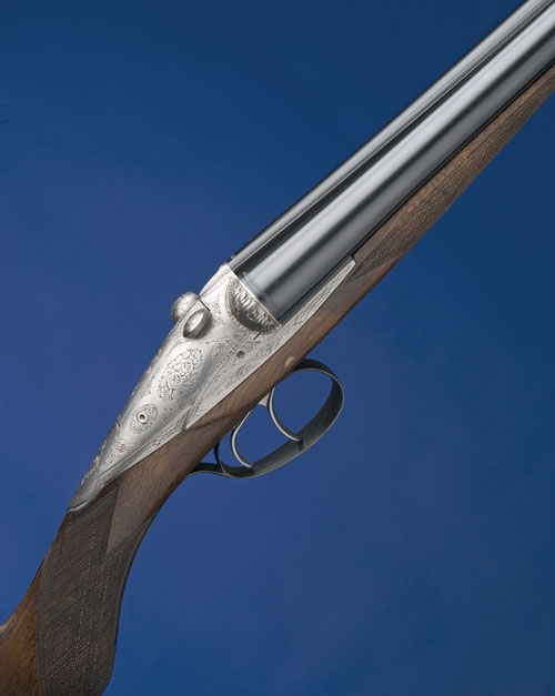 27 5/8in. (70cm) nitro barrels with matt rib, flats signed 'FRANCOIS SOLEILHAC', 2 1/2in. chambers, bored approx. 1/2 and 3/4 choke, manual sliding breech with striker bar, manual side safety switch, bouquet and scroll engraving with carved leaf fences, bright finish overall, 14 3/4in. semi-pistolgrip stock including 1 1/4in. horn buttplate, weight 5lb. 12oz.