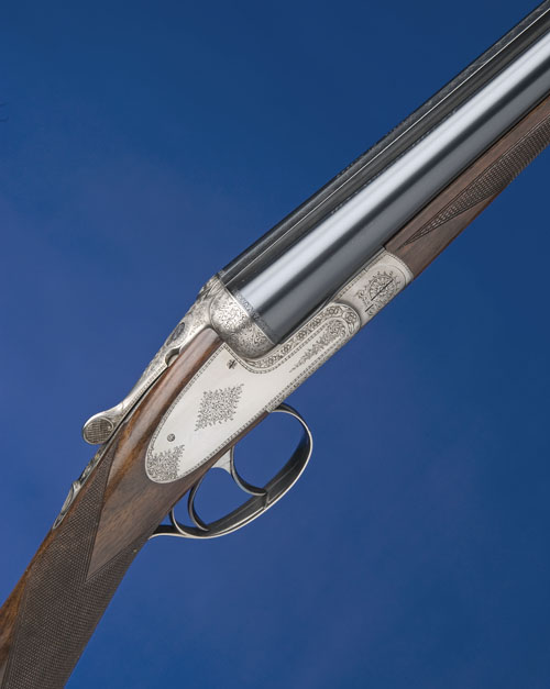 27 1/2in. nitro barrels with raised matt rib, 2 3/4in. chambers, bored approx. 1/2 and 3/4 choke, treble-grip action, manual safety, rounded bar, articulated front trigger, action and decorative lockplates finely engraved with beaded and floral borders with acanthus scrollwork, bright finish overall, 14 7/8in. highly-figured stock, weight 5lb. 14oz.