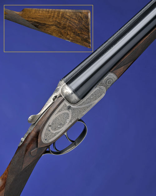 27 5/8in. (70cm) nitro chopperlump barrels with raised matt rib, tubes engraved 'AUGUSTE FRANCOTTE BREVETE LIEGE', 2 3/4in. chambers, bored approx. 1/2 and 3/4 choke, automatic safety, removable striker discs, cocking-indicators, articulated front trigger, best fine acanthus scroll engraving, the triggerplate signed 'PH. GRIFNEE. 75', bright finish overall, 14 1/2in. well-figured stock, weight 6lb. 10oz.