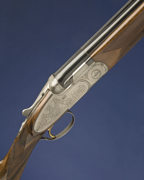 27 7/8in. nitro reproved Boehler Antinit steel barrels (proved in 2010) with 8mm ventilated matt top-rib, 2 3/4in. chambers, bored approx. 1/4 and full choke, hold-open toplever, manual safety, gold-washed triger, border and foliate scroll engraving, bright finish, 14 5/8in. figured stock including 1 3/4in. ebonite extension, weight 7lb. 11oz., in its makers case