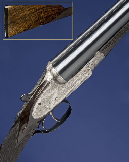 26in. replacement nitro barrels by the maker in 1972, the tubes engraved 'STEPHEN GRANT & SONS. 7. BURY STREET. ST. JAMES'S. LONDON. ENGLAND', the rib engraved 'PATENT EJECTOR' and scroll engraved at the breech-end, 2 1/2in. chambers, bored approx. imp. cyl. and 1/4 choke, fluted fences, automatic safety with gold-inlaid 'SAFE' detail, removable striker discs, best fine acanthus scroll engraving, 14 3/4in. highly-figured stock including 1/2in. ebonite extension, weight 6lb. 13oz., in its leather case. We are kindly informed by the makers that this shotgun was completed July 1903 for a C.M. Hilder, Esq.