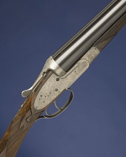 27 5/8in. (70cm.) nitro chopperlump barrels, 2 3/4in. chambers, bored approx. 1/2 and 3/4 choke, bolstered treble-grip action, manual safety with gold-inlaid 'S' detail, removable striker discs, articulated front trigger, triggerguard with slight dent, 14 1/4in. figured stock, weight 6lb. 2oz., in a wooden case
