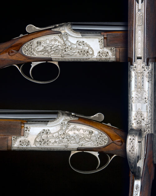 26 1/4in. nitro barrels with 6mm ventilated matt top-rib, 2 3/4in. chambers, bored approx. 1/4 and 3/4 choke, hold-open toplever, manual safety with integral barrel selector switch, the action and furniture engraved with scrolled borderwork, the decorative sideplates with vignettes of partridge and pheasant, 14 1/4in. figured stock, weight 6lb., in a suede case