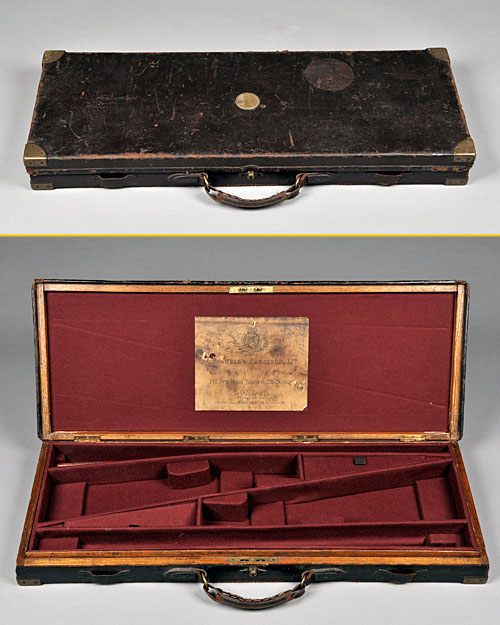 to accept 30in. barrels and re-lined throughout in burgundy baize, the lid carrying a Cogswell and Harrison trade label, patinated exterior with plain brass escutcheon, straps missing and some minor wear to stitching.