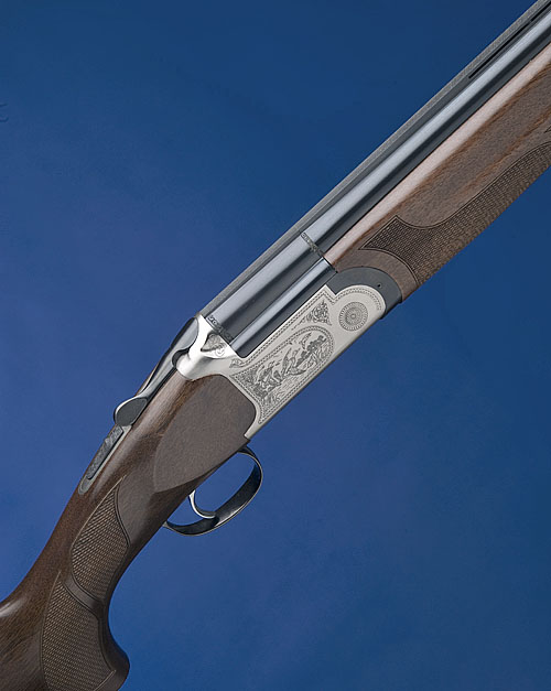 30in. nitro barrels with 7mm ventilated matt top-rib, 3in. chambers, multi-chokes (no spares), hold-open toplever, manual safety, game scene and border engraved silver action, 14 3/4in. pistolgrip stock with sling swivels and buttplate, weight 7lb. 4oz.