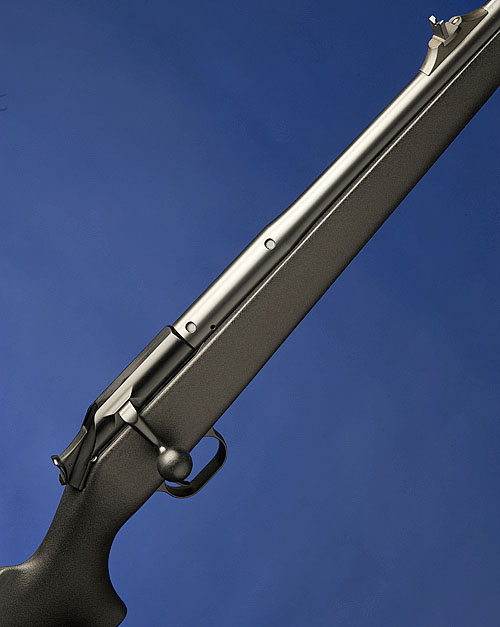 23 7/8in. heavy nitro barrel with block mounted open sights and ramp-mounted blade foresight, matt blued finish overall, 14 1/8in. composite pistolgrip stock with front sling swivel (no rear) and including 3/8in. rubber recoil pad, weight 8lb. 8oz.