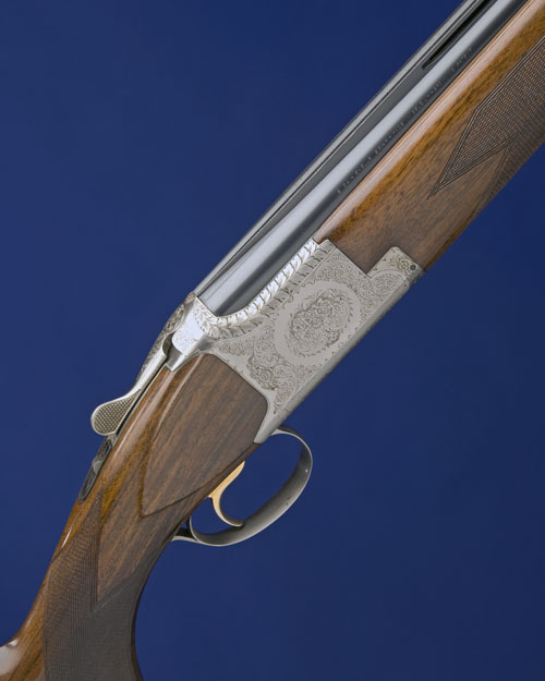 30in. nitro barrels with 12mm ventilated matt top-rib, 2 3/4in. chambers, bored approx. 1/4 and 3/4 choke, hold-open toplever, manual safety with integral barrel selector switch, gold-washed trigger, floral and scroll engraving, bright finish overall, 15 1/4in. pistolgrip stock including 1in. wooden extension, weight 7lb. 6oz.
