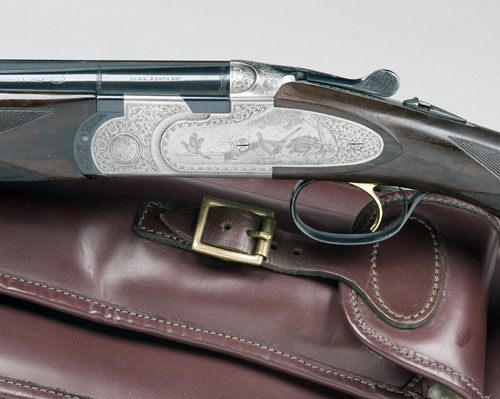 extra 28in. nitro 28-bore barrels, 2 3/4in. chambers, bored approx. true cyl. and 1/4 choke, hold-open toplever, automatic safety with integral barrel selector switch, gold-washed single trigger, the action and furniture engraved with floral scrollwork, the decorative lockplates engraved with scenes of game birds in their naturalistic habitat, 15in. figured pistolgrip stock including 3/4in. wooden extension, weight 6lb. 5oz. (20-bore) 6lb. 8oz. (28-bore), in a good quality burgundy leather padded full-length gunslip with provision for the spare set of barrels