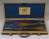 28in. nitro reproved barrels, ribs gold-inlaid '1' and '2', engraved 'WATSON BROS. 29 OLD BOND STREET. LONDON.' and with bold arabesque engraving at the breech ends, 2 1/2in. chambers, bored approx. imp. cyl. and 3/4 choke, toplevers gold-inlaid '1' and '2', treble-grip actions, automatic safeties with gold-inlaid 'SAFE' details, fully engraved with bold arabesque scrollwork interspersed with ribbons, retaining traces of original colour-hardening and finish, 15 1/2in. figured stocks with diamond grips and including 7/8in. rubber recoil pads, weight 7lb., in their brass-cornered oak and leather case (some baize replaced).