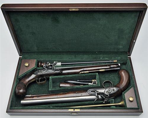 late 18th century, with 12in round unsighted barrels, flat, border lined, banana-shaped locks with bevelled edges, stepped tails, bolts, rainproof pans and roller frizzens, walnut full-stocks with curved butts with flattened sides, brass furniture, pineapple finials, horn-tipped wooden rammers (one replaced), wood-work lightly distressed and iron-work brushed bright on both pistols, TOGETHER WITH a modern wooden case with green velvet lining and a selection of unassociated accessories.