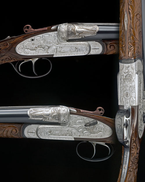 27 1/2in. nitro barrels with Churchill-rib, gold-inlaid with the makers name and deeply carved at the breech with hawks descending upon prey, 2 3/4in. chambers, bored approx. 1/4 and full choke, hand-detachable lockplates, articulated front trigger, cocking-indicators, toplever pierced with a running hare, fences, action and lockplates naively carved with duck, fox and hounds and hounds and stag, the triggerplate with a retriever, bright silver finish, 14 5/8in. semi-pistolgrip stock, semi-pistolgrip and fore-end heavily carved with acanthus leaves, weight 7lb.