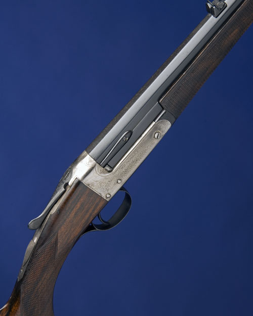 26in. nitro reproved octagonal barrel, tubed to .22LR from .250 rook rifle, partially matted top flat, open sights with folding leaf sights for 50, 100 and 150 yards, engraved 'WILLIAM POWELL & SON. CARRS LANE. BIRMINGHAM.', automatic safety with gold-inlaid 'SAFE' detail, fence with engraved arcading, border and scroll engraving, brushed and blued finish overall, 14 5/8in. well-figured pistolgrip stock (well-repaired crack at hand), steel pistolgrip-cap, fore-end with horn finial, weight 5lb. 9oz.