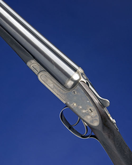 30in. nitro barrels, the tubes engraved 'HOLLAND & HOLLAND. 98. NEW BOND STREET' (left wall thickness below recommended minimum), 2 1/2in. chambers, bored approx. imp. cyl. and 1/4 choke, automatic safety with gold-inlaid 'SAFE' detail, gold-inlaid cocking indicators, border engraving, retaining much original colour-hardening and finish, 14 1/2in. figured stock including 1/2in. wooden extension, weight 6lb. 11oz., in its makers leather case. We are kindly informed by the makers that this shotgun was completed November 1907.
