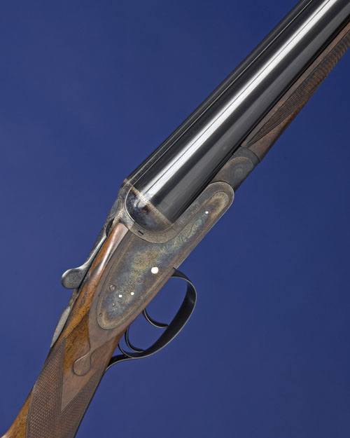 30in. replacement nitro chopperlump barrels (by the makers circa 1999), the rib inscribed 'BOSS & CO. 13. DOVER STREET. PICCADILLY. LONDON. W.1.', 2 3/4in. chambers, bored approx. imp. cyl. and 1/2 choke, automatic safety with gold-inlaid 'SAFE' detail, gold-inlaid cocking-indicators, best fine bouquet and scroll engraving, retaining virtually full renewed colour-hardening and finish, 15 1/4in. well-figured replacement stock, small insert repair to fore-end wood, weight 6lb. 13oz., in a brass-cornered leather case. The makers have kindly confirmed that this shotgun was completed circa 1896 for a G. Montagu, Esq.