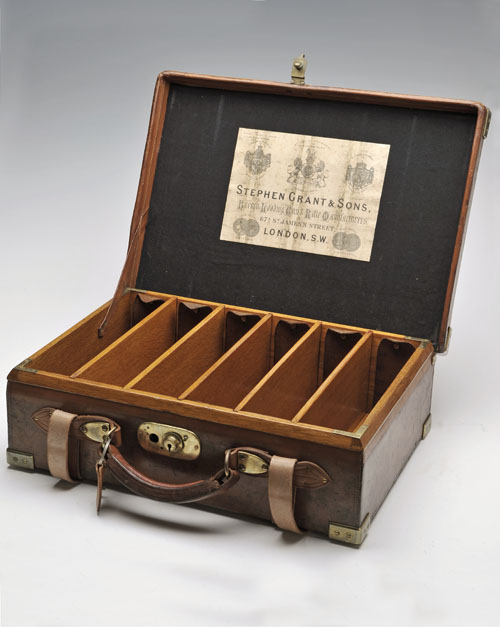 the interior with blue baize to lid carrying a Stephen Grant trade label, six oak divided compartments (dividers and lifters extant), central brass lock with key, patinated exterior impressed 'T.R. Clutterbuck, Coldstream Guards' with good quality replacement straps and handle bolsters.