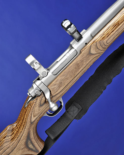 26in. matt stainless steel nitro barrel threaded for a sound moderator, receiver fitted with scope rings, 13 3/4in. laminate pistolgrip stock including 5/8in. rubber recoil pad, with Harris bipod, canvas sling