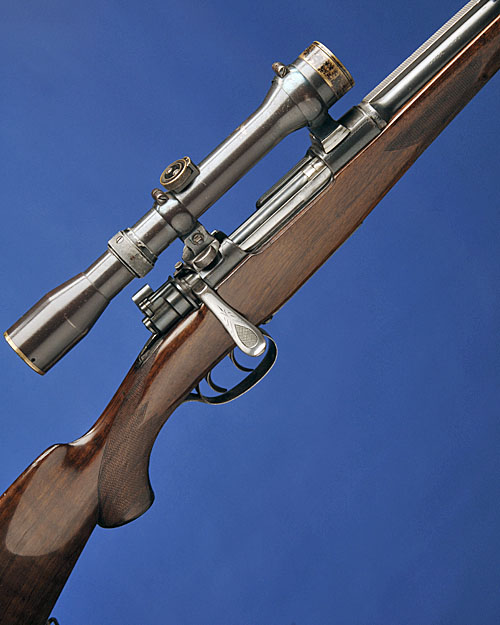 22 3/8in. nitro barrel with matt rib, ramp-mounted bead fore-sight, rear-sight of one standing and one folding leaf, the receiver fitted with a Hensoldt Wetzlar telescopic sight, set triggers,14in. pistolgrip stock including buttplate, with horn schnabel fore-end tip, chequered fore-and and grip, horn pistolgrip cap, sling swivels, with a leather telescopic sight case