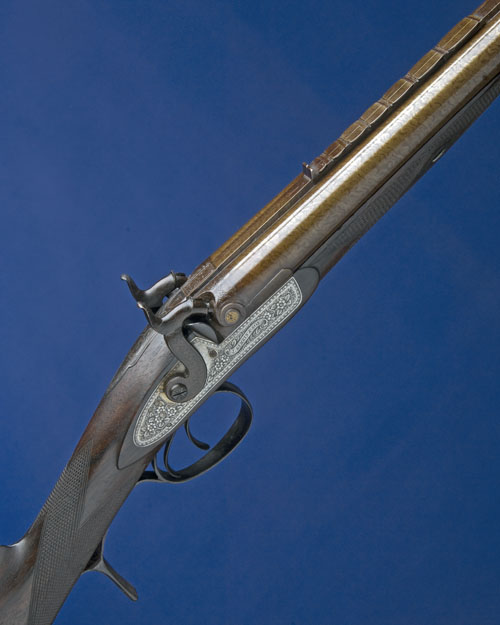 circa 1840, with 30in sighted re-browned barrels, broad matted top-rib signed 'JAMES SIMKIN & SON, BOLTON, seven-leaf folding uncut ladder sight with platinum lines sighted to 900 yds, the false-breech, tang and lockplates profusely engraved with floral motifs and borders, scroll engraved dolphin hammers, walnut chequered half-stock with engraved steel furniture (trigger guard repaired), pineapple finial, circular steel patch-box engraved with a lion in a mountain setting, shield-shaped white metal escutcheon with initials 'TCL' and 'RIVINGTON, LANCASHIRE', eyelets for sling and replacement ramrod (locks brushed bright, refinished throughout)