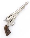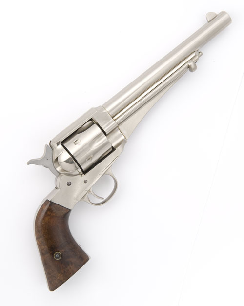 circa 1885, with 7 1/2in. sighted barrel, top signed 'E. REMINGTON & SONS. ILION. NY.USA', side-mounted ejector rod, plated cylinder and frame, calibre marked '44' on rear of trigger-guard, walnut grips, the whole being an early re-nickel (hammer with welded repair)