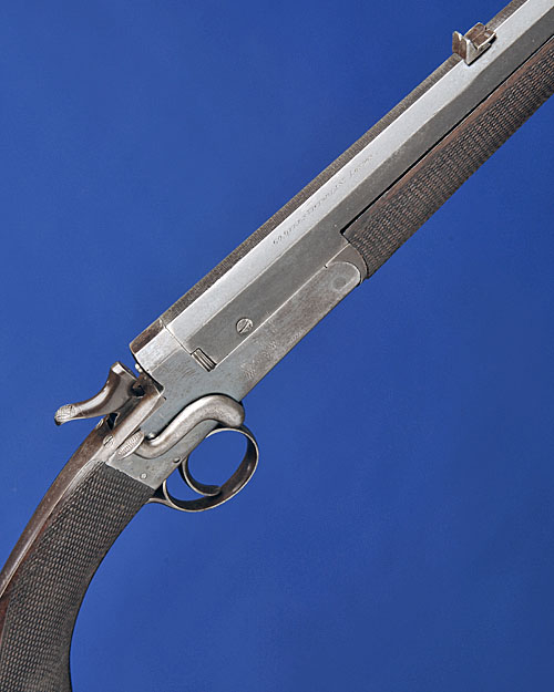 26in. lined octagonal nitro reproved barrel (from .360 rook) with matted top flat, open sights and folding leaf sight for 50 and 100 yards, bead foresight, engraved 'W.J. JEFFERY. 60. QUEEN VICTORIA ST. LONDON.', non-selective ejector, plain action retaining traces of blued finish, 14 5/8in. pistolgrip stock with steel pistolgrip-cap and buttplate, weight 5lb. 6oz.