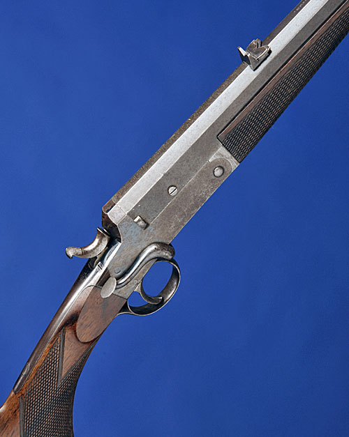 28 1/2in. black powder only octagonal barrel with partially matted top flat, open sights with folding leaf sights for 50, 100 and 150 yards, bead foresight, engraved 'HAMMOND BROS. WINCHESTER.', plain action retaining very slight traces of blued finish, 14 7/8in. well-figured pistolgrip stock with horn pistolgrip-cap and buttplate, weight 5lb. oz.