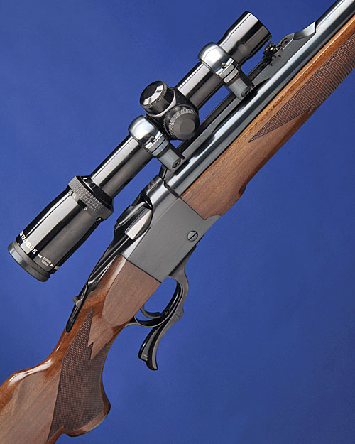 23 7/8in. nitro barrel with ventilated raised matt sight rib, folding open sights and ramp-mounted bead foresight, the sight rib mounted with a Burris 1.75X-5X FULLFIELD II telescopic sight, manual safety, blued finish overall, 13 3/4in. figured pistolgrip stock, chequered pistolgrip and fore-end, pistolgrip-cap, sling eyes and 1/2in. rubber recoil pad, weight 9lb. 4oz.