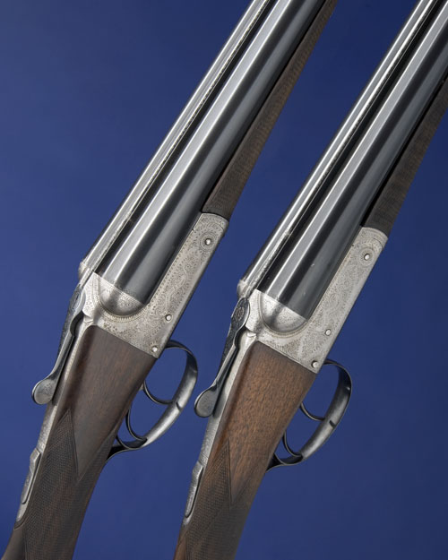 28in. replacement nitro barrels (by the maker in 1979), the ribs engraved 'NEW BARRELS BY J. VENABLES & SON. 99. ST ALDATES. OXFORD.' 2 1/2in. chambers, bored approx. true cyl. and 1/2 choke (No.1) imp. cyl. and 3/4 choke (No.2), treble-grip actions, automatic safeties with silver-inlaid 'SAFE' details, border and scroll engraving, brushed bright finish, 14 1/2in. stocks (slight crack to No.2 fore-end wood), weight 6lb. 9oz., in a brass-cornered oak and leather double guncase