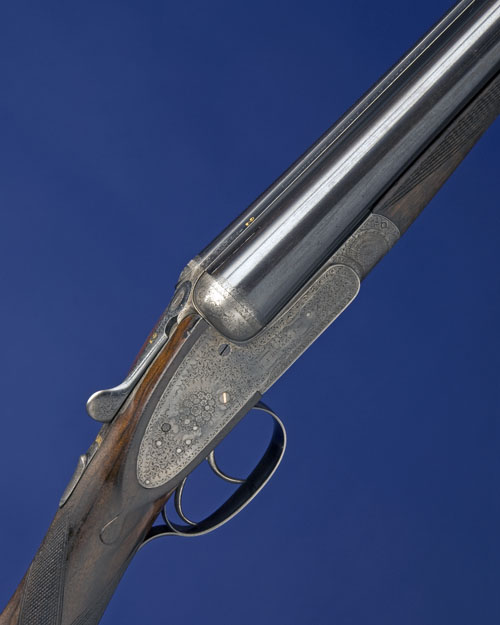 No. 2 of a pair, 28in. nitro barrels, the rib inscribed ''MADE OF SIR JOSEPH WHITWORTH'S FLUID PRESSED STEEL. H.J. HUSSEY LTD 81 NEW BOND STREET. LONDON.', scroll engraved and gold-inlaid '2' at the breech end, 2 3/4in. chambers, bored approx. imp. cyl. and 1/2 choke, toplever gold-inlaid '2', automatic safety with gold-inlaid 'SAFE' detail, gold-inlaid cocking-indicators, best fine bouquet and scroll engraving, retaining some original colour-hardening and finish, 15 1/4in. figured replacement stock, weight 6lb. 13oz., in a brass-cornered oak-lined leather case