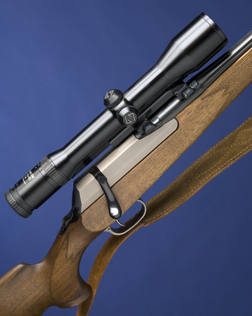 21 1/2in. fluted nitro barrel with block mounted open sights and ramp-mounted blade foresight, the receiver mounted with a Zeiss Diavari ZM 1,5-6x42 T* telescopic sight in quickly-detachable mounts, three-stage safety, brushed gunmetal breech, hinged triggerplate and detachable magazine, 14 1/4in. pistolgrip stock including buttplate, with chequered pistolgrip-cap and fore-end, sling swivels, weight 8lb. 6oz.