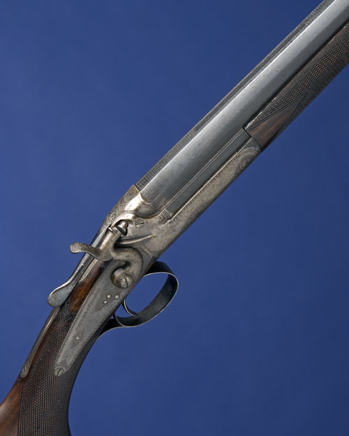 27in. nitro reproved octagonal barrel (smoothbored from a rook rifle calibre) with matt top flat, engraved 'COGSWELL & HARRISON, 142, NEW BOND STREET. LONDON.', and dovetailed section where open sights removed, no foresight, carved percussion fence, slender toplever, rebounding back-action lock, border and fine acanthus scroll engraving, retaining traces of original colour-hardening, 14 3/8in. figured pistolgrip stock with flat top chequering, horn pistolgrip-cap, light damage at heel, fore-end with Anson push-rod release catch and carved horn finial, weight 4lb. 14oz.