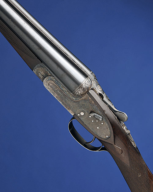 28in. nitro chopperlump barrels (slightly loose on action), 2 3/4in. chambers, bored approx. 1/4 and 3/4 choke, engraved arcaded fences, automatic safety, removable striker discs, hand-detachable lockplates, gold-inlaid cocking-indicators, non-selective single trigger, fully engraved with scrollwork, retaining much original colour-hardening and finish, 14 1/2in. stock, weight 7lb.