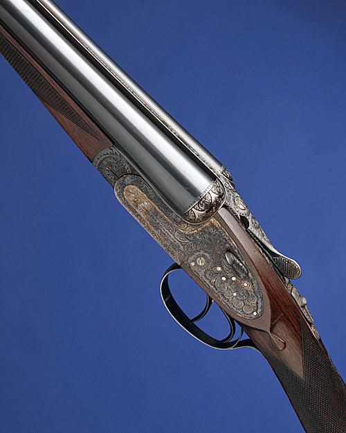 28in. nitro chopperlump barrels, 2 3/4in. chambers, bored approx. imp. cyl. and 1/2 choke, engraved arcaded fences, removable striker discs, automatic safety, hand-detachable lockplates, gold-inlaid cocking-indicators, articulated front trigger, rolled-edge triggerguard, fully scroll engraved, retaining virtually full original colour-hardening and finish, 14 3/4in. stock, weight 6lb. 7oz.