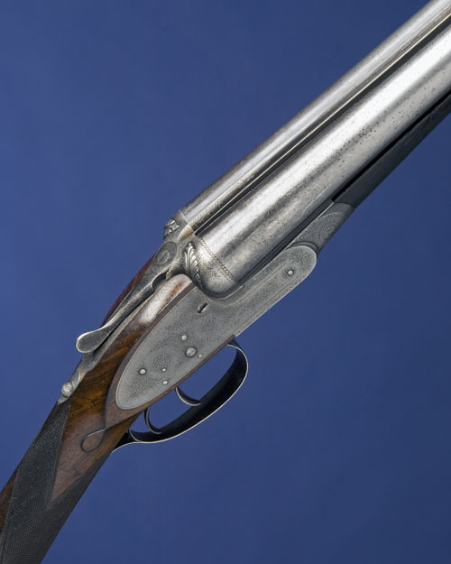 28in. nitro replacement barrels (by another), 2 1/2in. chambers, bored approx. true cyl. and 3/4 choke, treble-grip self-opening action with carved leaf fences, automatic safety with gold-inlaid 'SAFE' detail, removable striker discs, arrow cocking-indicators, best fine bouquet and scroll engraving, retaining very slight traces of original colour-hardening, 14 1/8in. figured replacement stock (some discolouration at the butt from a stock boot extender), fore-end wood worn, weight 6lb. 12oz.
