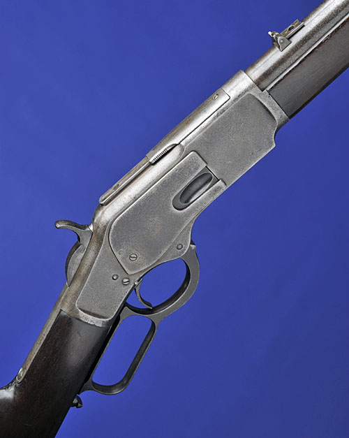 later second model for 1879, with 20in. round, sighted barrel marked 'WINCHESTER REPEATING ARMS, NEW HAVEN, CT' and patent dates to 1860, early non-adjustable twin-leaf folding carbine rearsight, smooth dust-cover with screw on rail, tang with no provision for peep-sight, saddle-ring on l/h side of receiver, no calibre designation on lifter block, walnut stock and forend, steel carbine heel-plate with sliding trapdoor, forend with one band and full-length magazine, the whole lightly worn and patinated all over; together with a factory letter.