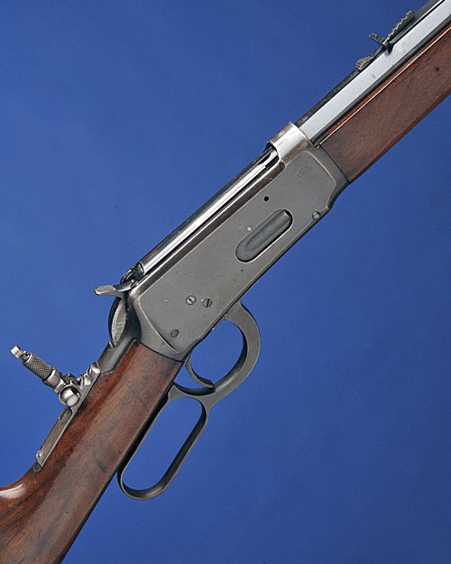 for 1922, with blued 26in octagonal, sighted barrel marked 'MANUFACTURED BY THE WINCHESTER REPEATING ARMS CO, NEW HAVEN CONN USA, PATENTED AUGUST 21 1894', blued receiver with original peep-sight fitted to top-tang, original varnish to stock and forend, crescent heel-plate and full length magazine, the whole remaining in good order with the majority of its original blued finish