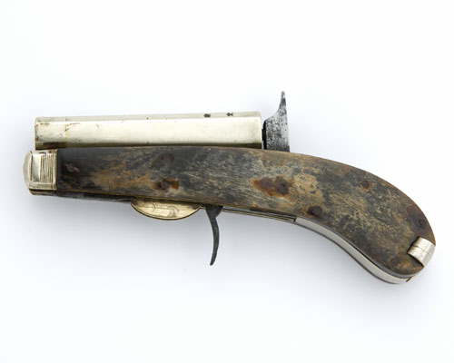 unsigned, but probably by Unwin & Rogers, Sheffield, mid 19th century, with 3 1/2in white metal sighted barrel with Birmingham proofs, iron frame with brass bolsters, the large knife blade missing, the smaller broken approximately half way along, concealed trigger, horn scales, retaining its original white metal ball mould and iron tweezers, white metal butt-trap (some corrosion to exposed iron parts).