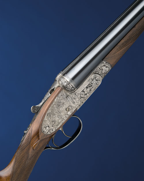 27 3/4in. nitro reproved chopperlump barrels (in 2010), rib engraved 'J. BLANCH & SON. CULLUM STREET. LONDON. E.C.', 2 3/4in. chambers, bored approx. imp. cyl. and 1/4 choke, Spanish made, automatic safety with gold-inlaid 'SAFE' detail, fences deeply carved in relief with foliage and alighting mallard on a stippled background, gold-inlaid cocking-indicators, rolled-edge triggerguard, the action, lockplates and furniture engraved with scrolling foliate motifs surrounding game scenes of wild boar and boar hound and a Victorian wildfowling scene, all on a matt background, bright finish, 15in. figured stock including 5/8in. wooden extension, weight 6lb. 7oz.