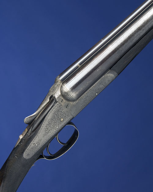 28in. sleeved steel to damascus nitro barrels, 2 3/4in. chambers, bored approx. imp. cyl. and 1/4 choke, action face with patent gas-checks, automatic safety with gold-inlaid 'SAFE' detail, gold-inlaid cocking-indicators, back-action lockplates, right ejector at fault, bold acanthus scroll engraving, 14 5/8in. well-figured stock (pinned left overhorn, cracked to both underhorns) including horn buttplate, weight 7lb. 1oz.