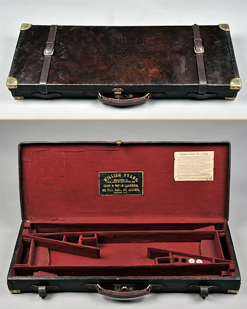 to accept 30in. barrels, William Evans trade lade to interior burgundy baize, two unassociated snap-caps, the patinated exterior impressed with the name 'R.H. Henning', replacement straps and handle, the whole showing evidence of repair work, moderate wear to hinge.