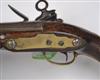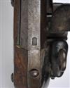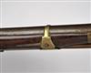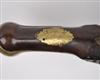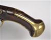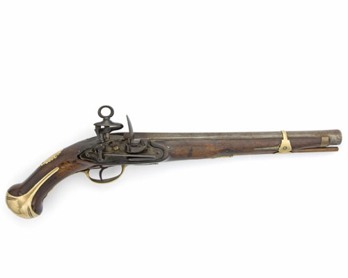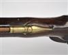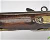 circa 1790, with unsighted two-stage slightly swamped barrel stamped with an illegible three-line makers cartouche, military pattern lock-plate with replaceable pan, large ring to top of cock screw, brass side-plate stamped '0 N 38' and two screws possibly for a belt-hook (missing), walnut full-stock with fancy brass coat-of-arms escutcheon (worn), long-spurred brass butt-cap with slot for lanyard ring (missing), brass barrel band, muzzle-cap and trigger-guard, replacement rammer (light pitting to iron parts, fore-stock and butt cracked through and repaired, brass-work heavily polished)