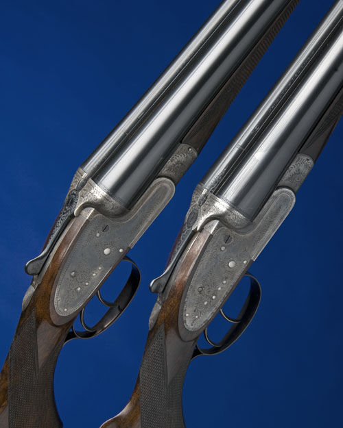 30in. nitro reproved barrels, No.2 sleeved, the ribs engraved 'ARMY & NAVY C.S.L. LONDON' with '1' and '2' at the breech-ends, bored approx. imp. cyl and 1/4 choke (No.1), imp. cyl. and 1/2 choke (No.2), treble-grip actions, automatic safeties with inlaid 'SAFE' details, removable striker discs, border and partial scroll engraving, No.1 retaining some original colour-hardening and finish, No. 2 brushed bright, 14in. figured pistolgrip stocks with steel pistolgrip-caps, weight 6lb. 9oz. (No.1) 6lb. 14oz. (No.2), in their leather double guncase