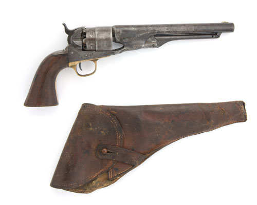 for 1866, with 8in round sighted barrel signed 'ADDRESS COL. SAM'l COLT NEW-YORK U.S. AMERICA', nickel-silver fore-sight, cylinder engraved with naval scene, patent no. over-stamped with last four digits of serial no., steel frame not cut for shoulder-stock and marked 'COLTS PATENT', brass trigger-guard, steel grip-strap a replacement from gun no xx5735, wood grips, the base of which crudely carved with two sets of initials (the whole with very little finish, bruising and discolouration to metal, hammer with old repair, replacement non-original trigger), TOGETHER WITH a period soft-leather full-flap lined holster, (stitching loose, extensive wear)