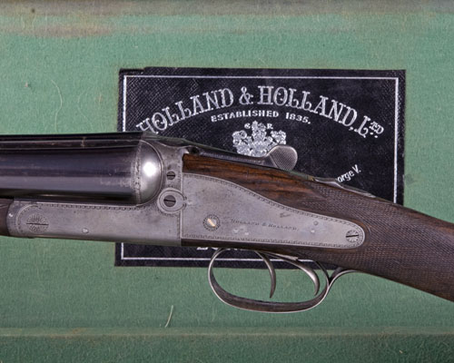 28in. replacement nitro barrels (by the makers), the tubes engraved 'HOLLAND & HOLLAND. 98. NEW BOND STREET, LONDON.' and the rib 'DOMINION', 2 3/4in. chambers, bored approx. 1/4 and 3/4 choke, automatic safety with gold-inlaid 'SAFE' detail, gold-inlaid cocking indicators, border engraving, 14 3/8in. figured stock including 5/8in. wooden extension, weight 6lb. 9oz., in its canvas and leather case
