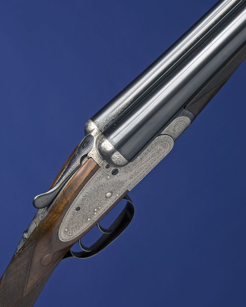 30in. replacement nitro barrels (in 1962), rib engraved 'F.T. BAKER. 29. GLASSHOUSE ST. PICCADILLY CIRCUS. LONDON.', 2 1/2in. chambers, bored approx. 1/2 and 3/4 choke, automatic safety with gold-inlaid 'SAFE' detail, border and acanthus scroll engraving, brushed bright and reblued finish overall, 15in. figured stock including 1 1/8in. leather covered recoil pad, weight 7lb., in its leather case (damaged) with provision for two sets of barrels.