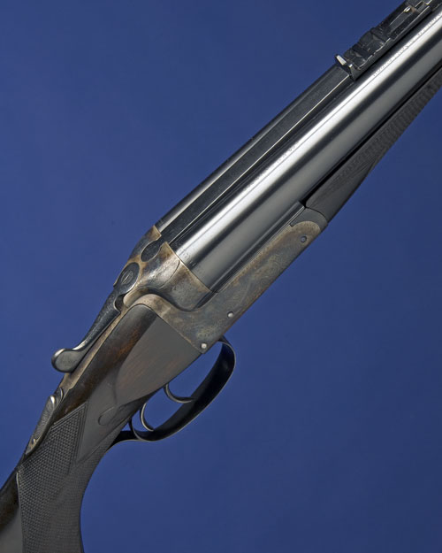 26in. nitro Krupp-steel chopperlump barrels, matt sight rib with silver-inlaid open sights and folding leaf sights for 100, 200 and 300 yards (missing iron sights) and ramp-mounted bead foresight (missing moonsight), tubes engraved 'A. HOLLIS & SON. LONDON. 400H.V. CARTRIDGE. 60 GRS. CORDITE. 400 GRS. BULLET.', large treble-grip action with removable striker discs (some scarring to action face), manual safety with gold-inlaid 'SAFE' detail, border and scroll engraving, retaining virtually full renewed colour-hardening and finish, 14 7/8in. well-figured pistolgrip stock with cheekpiece (with blank silver oval), sling eyes, horn pistolgrip-cap and including 7/8in. rubber recoil pad, weight 9lb. 9oz.