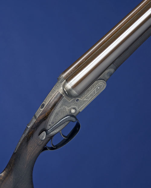 30in. nitro reproved damascus barrels, rib engraved '1' and 'ALEXr. HENRY, EDINBURGH AND LONDON. MAKER TO THEIR ROYAL HIGHNESS' THE PRINCE OF WALES AND DUKE OF EDINBURGH', 2 1/2in. chambers, bored approx. imp. cyl. and 1/4 choke, wall thicknesses below recommended minimum (left wall thickness well below), sidelever action with slender standing breech, carved leaf serpentine fences, broad topstrap with automatic safety, blue enamel 'SAFE' detail, removable striker discs, protruding tumbler pivots, best fine acanthus scroll engraving with ropework borders, retaining slight traces of original colour-hardening, 14 3/4in. highly-figured pistolgrip stock with inlet leather cheekpad, horn pistolgrip-cap and including 7/8in. wooden extension, weight 6lb. 2oz.