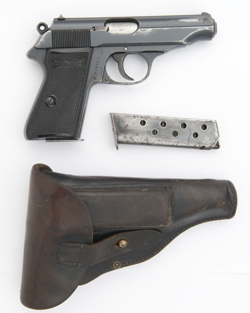 pre-war, with 3 3/4in barrel, blued, sighted slide marked with makers details and 'Walther' banner, blued frame with black plastic chequered grips with 'Walther' banner, German commercial proofs (holster wear throughout), TOGETHER WITH a period full-flap black leather holster marked ' A. WUNDERLICH NACH BERLIN', the date '1935' and a spare magazine.