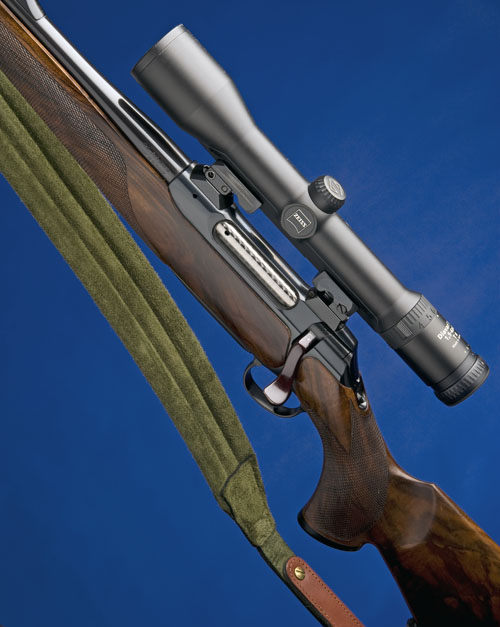 24in. blued nitro barrel with ramp-mounted blade fore-sight, ramp-mounted rear open sights, fitted with a Zeiss Diavari VM 1,5-6x42 T* telescopic sight in Apel quickly-detachable mounts, set trigger, 14in. figured pistolgrip stock including 3/4in. ventilated rubber recoil pad, schnabel fore-end tip, chequered fore-end and grip, pistolgrip cap, suede and leather sling in quick-release mounts, in a leather rifle slip