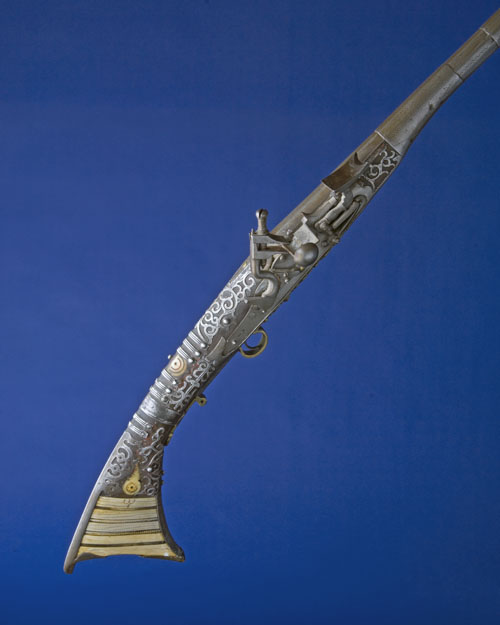 circa 1800, with 46in slender two-stage sighted barrel, swollen at the muzzle, plain 'Dutch-style' lock with sliding pan-cover, the wooden stock profusely covered in silver fret-work scrolls, coloured ivory panels, wire-work and other decoration towards the butt-end, the fore-stock with geometrically engraved steel bands and re-inforcement, the barrel with silver, florally engraved bands equally spaced to the muzzle (one missing), brass trigger-guard with silver inlay, original steel ram-rod (minor losses and wear throughout).