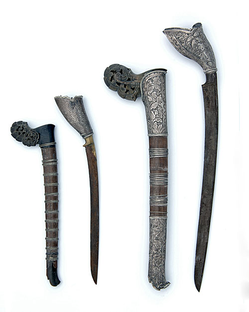 both mid to late 19th century with silver flared hilts, the first with 10in watered blade, silver-mounted wooden scabbard and bulbous carved horn throat (damage and losses throughout), the second with 7in blade and horn-mounted scabbard.